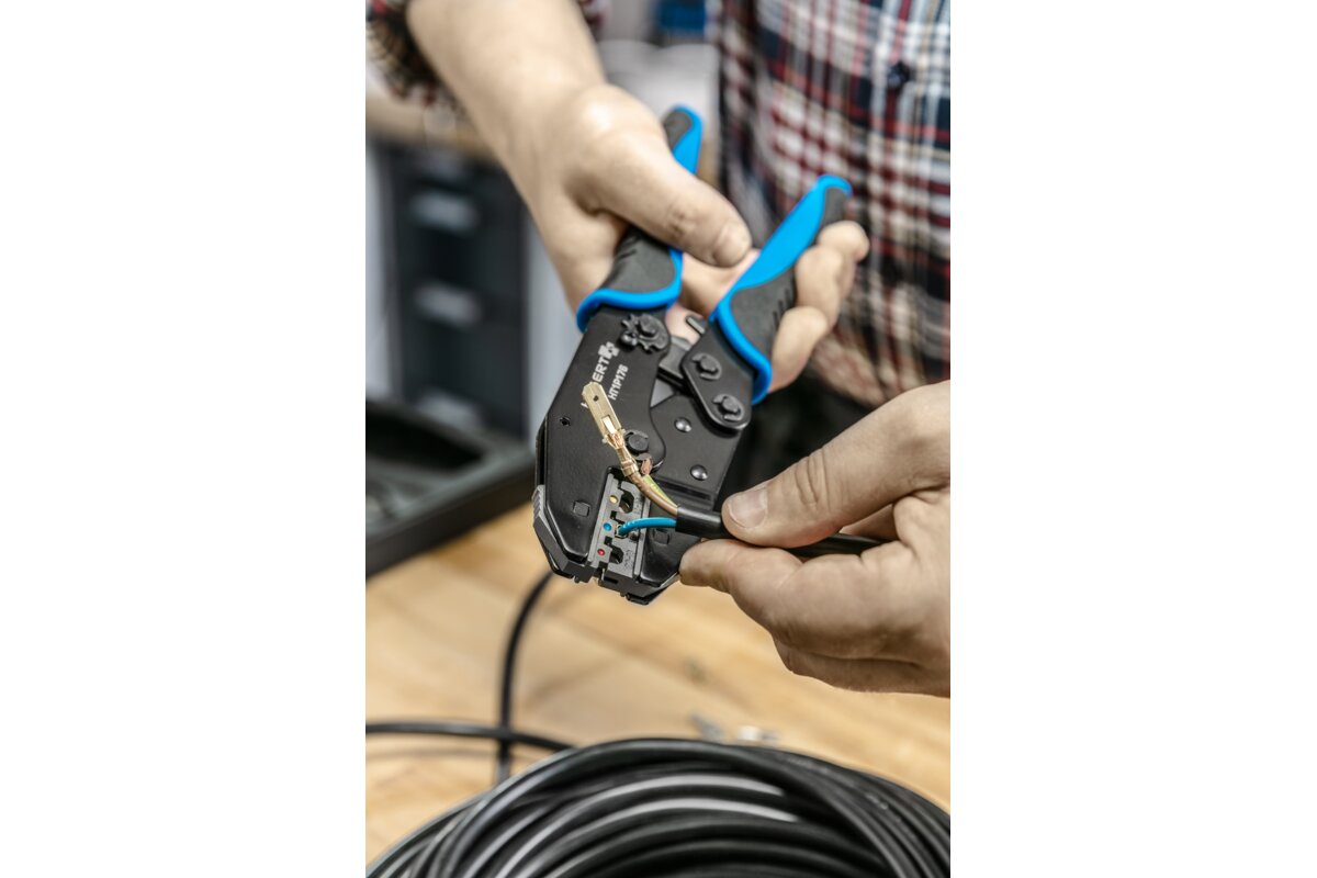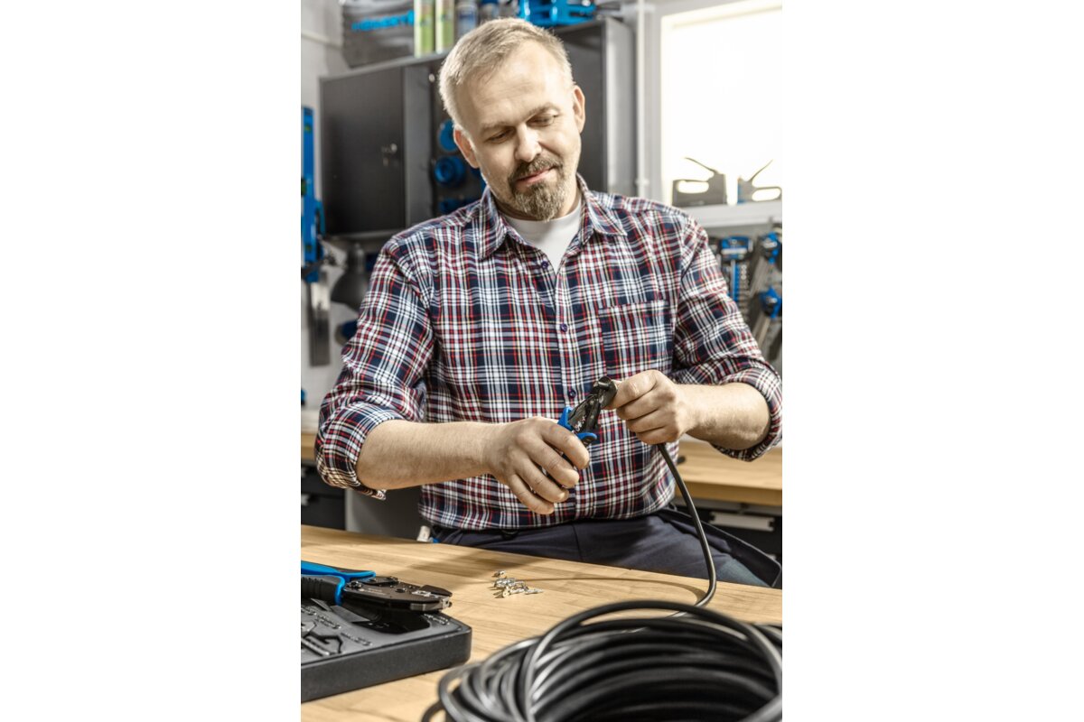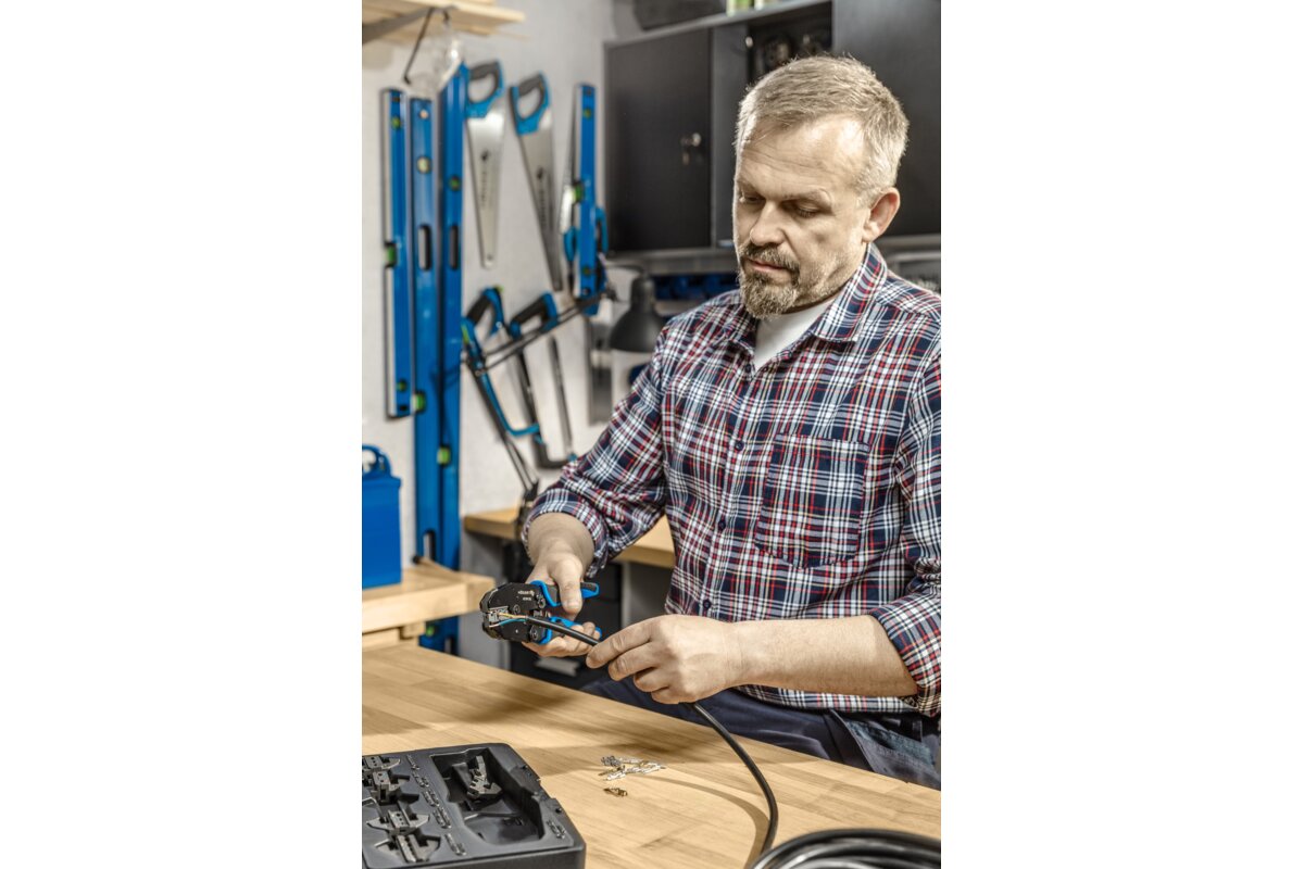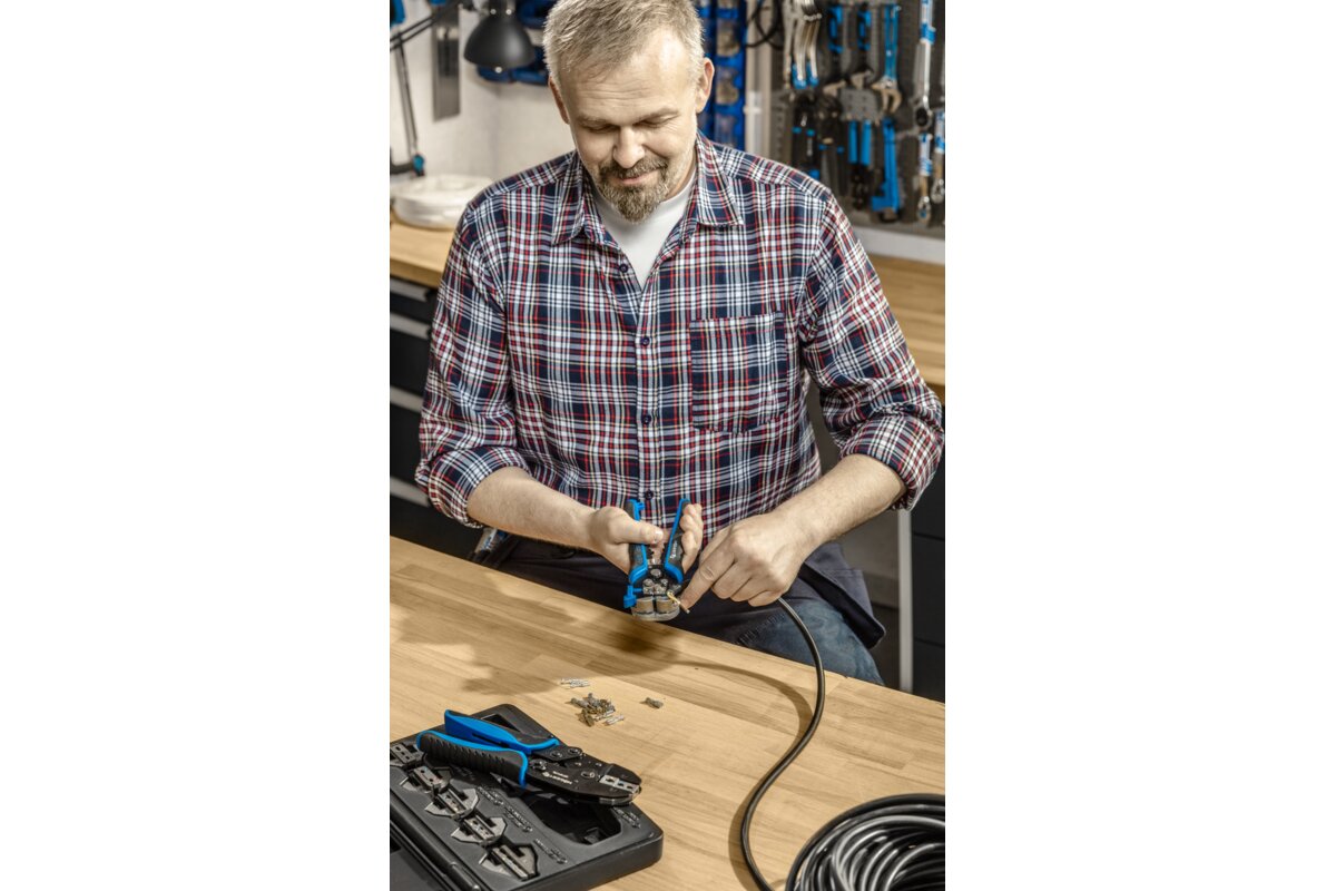 Clamping pliers with quick-change dies. 6 jaws included. The marking system makes it easier to install the jaws. Used in car mechanics, telecommunications, electronics, and other installation works. The freely selectable clamping dies make it possible to customise the tool.Characteristics