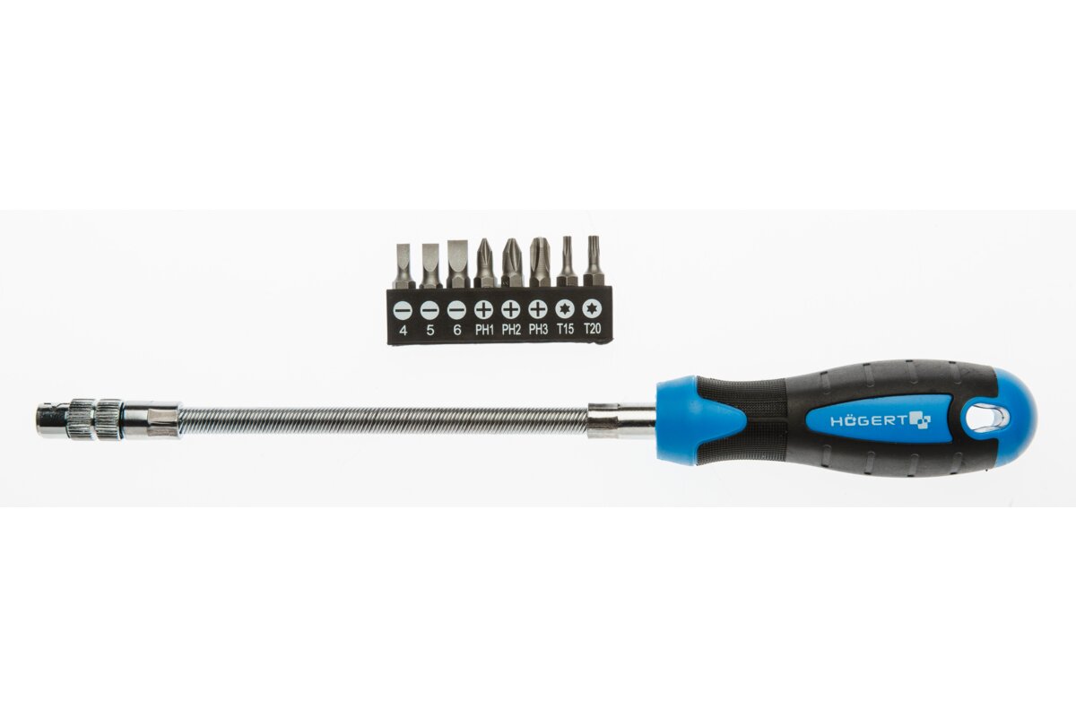 • product descriptiona screwdriver with a 215 mm flexible shaft and a set of bits: slotted bits 4.5 mm and 6 mm, ph1, ph2 and ph3 bits, as well as torx t15 and t20 bits. designed to bend around corners and get into hard-to-reach areas where a regular screwdriver cannot be handled.characteristics