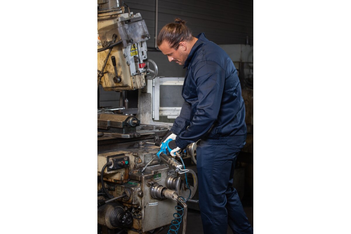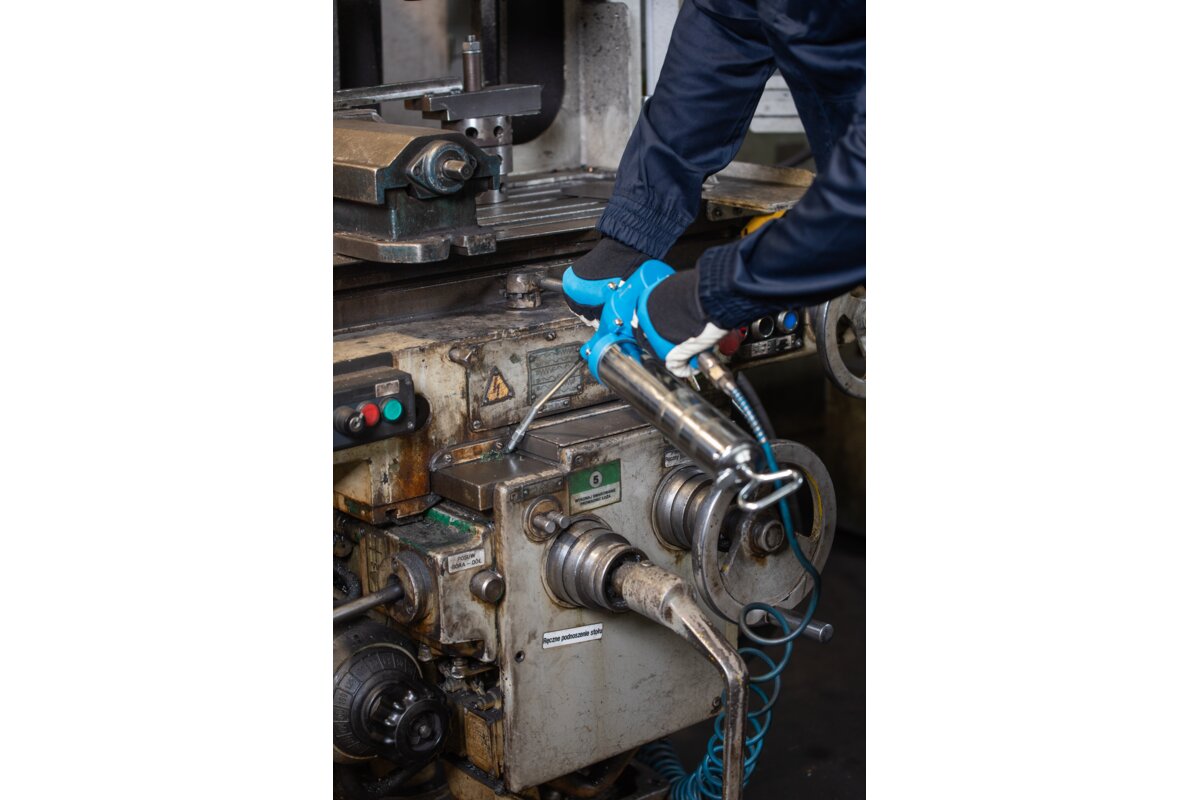 Pneumatic lubricator with a capacity of 400 cm3. It is used for high-pressure lubrication of mechanical elements such as shafts, pins, bearings and joints. Each time the trigger is pressed, one portion of grease is dispensed. Lubricator has 2 ways of loading – a 400 gram cartridge and loose grease.